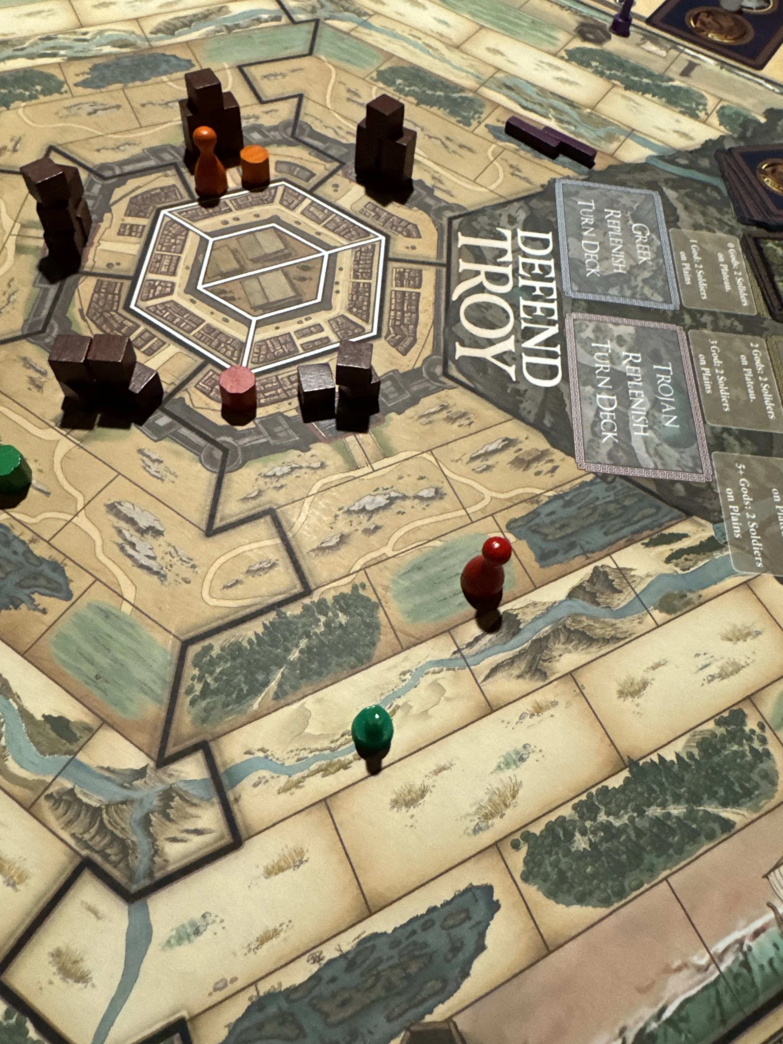 Defend Troy is a myth-inspired, card-driven strategy board game set during the siege of Troy. Our unique compoperative™ (competitive + cooperative) gameplay allows you to play three different modes, with your opponent being other players or The Fates: a fixed intelligence following divine patterns beyond your control.